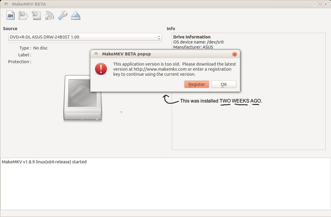 I installed this copy of MakeMKV from the source tarballs two weeks ago. Two. When I attempted to convert a disc this morning, I got this. This is the second time this software has “expired” on me. Funny, it worked just fine before the expiration date.