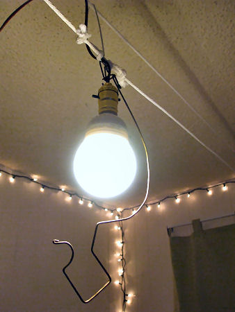 So I started brainstorming. Sitting in my closet was a ten-year-old compact fluorescent globe bulb and a bulb socket with a long power cable attached, which I assembled and loaned to my roomate for use back in 1997. But where would I hang it? Would I hang it over my desk? It'd help when reading and doing projects. But what if I get a couch and put it in the nearby corner? What if I wanted to read there? Well, I could hang it over there, I suppose. Or maybe hang two bulbs. My mind wandered.