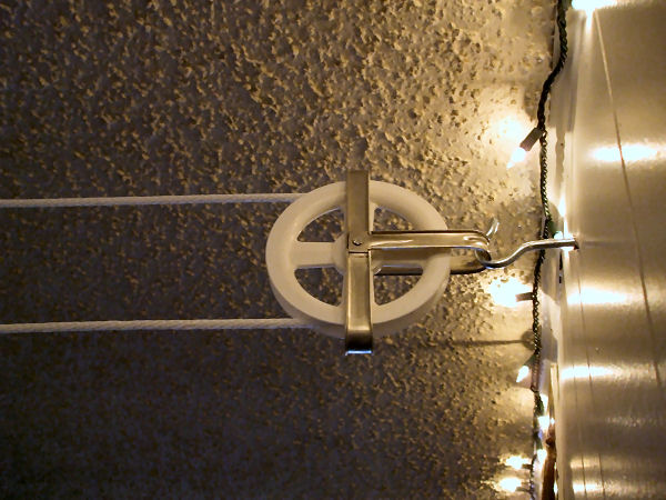 Further improvements could include using more pulleys or loops of stiff wire along the top rope to carry the power cable along its full length so the fixture, given enough power cable to stretch the distance, could be moved the entire excursion of the assembly from pulley to pulley. I thought about that in hindsight; it would've made a neater presentation, but would have completely blown my budget. There are also pulleys that could serve the function of the hanger wire on the top rope; they have a hook at the base and a pulley at the top. Or, failing everything, I could even further simplify the entire design and instead rig a single steel cable from wall to wall and hang the fixture on a moveable pulley that rides the cable. It all can get as industrial or as organic as you want to go.