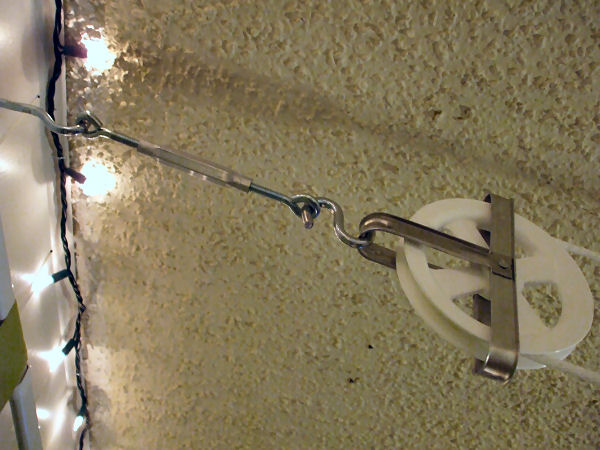 Attach tensioner: Hang the tensioner bolt on one of the anchor hooks. Keep in mind that this will increase the distance between the pulley and the wall. I chose to do this on the hook that straddles my curtains; now my pulley is further out and the fixture has no chance to contact the curtain material (a fire hazard). When hanging this bolt, make sure both of the ends are screwed out to their furthest excursion. Give yourself plenty of room; you want the bolt to be the longest it can be when you tie the rope hand-tight.