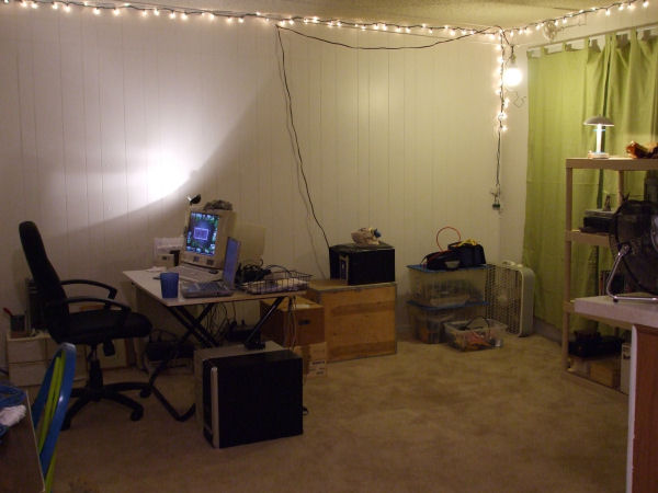 I've hung some strands of white xmas lights around the perimeter, powered by the dimmer-switched outlet, in the dim hope of alleviating the lighting issue. It produces a warm, diffuse glow which suits me fine. I also have a few desk lamps scattered about for bits of spot light and for area washes. For the first few weeks of my tenancy, this was fine. However, the first time I had a need for actual direct light while entertaining guests or trying to sign paperwork, I was completely in the dark.